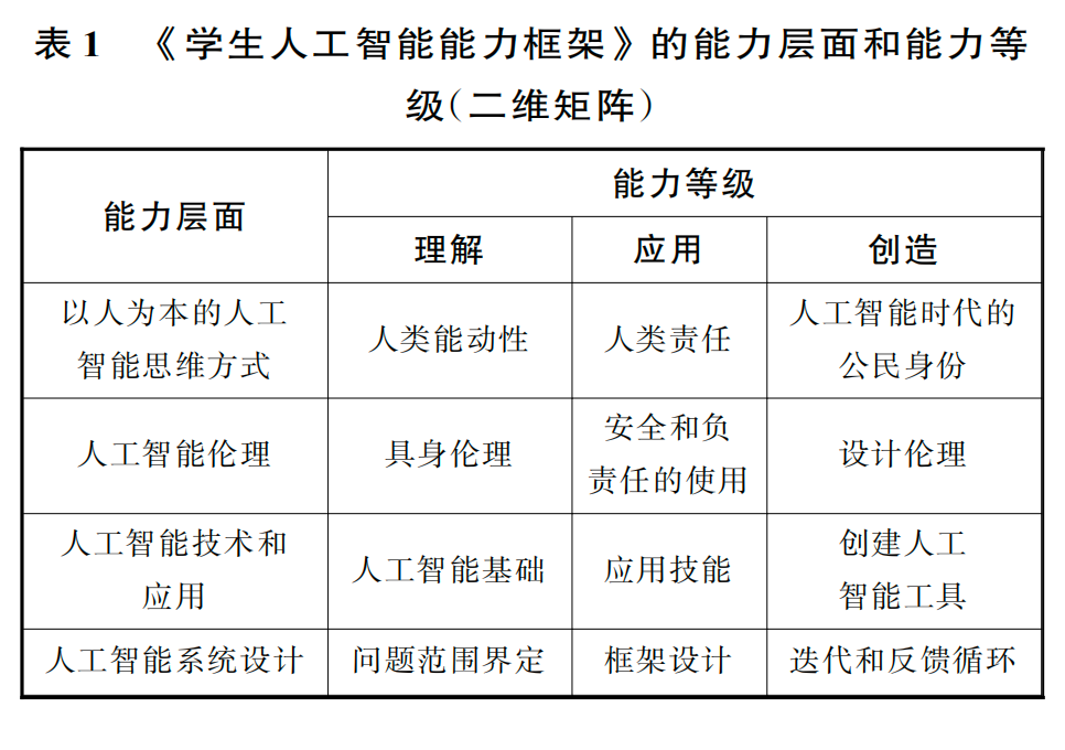4)人工智能系統(tǒng)設計,包括確定人工智能系統(tǒng)的問題范圍、框架構(gòu)建、訓練、測試和優(yōu)化的綜合工程技能。該框架的第二個維度涉及理解、應用和創(chuàng)造三個能力等級,旨在反映學生在四個能力層面的掌握水平。